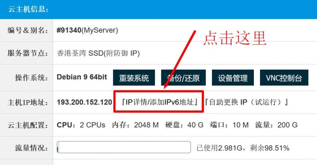 站长测试用的是最低配的VPS,2G内存、2核、40G SSD、10M带宽,下方显示的主频2.5GHz、I/O在427MB左右: